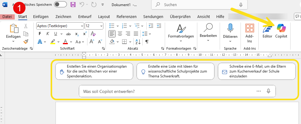 Um die offensichtlichen Microsoft KI-Funktionen in Word, insb. die Text-Vorschläge oben und den KI-Prompt "Was soll Copilot entwerfen?" zu deaktivieren, gehen Sie bitte wie folgt vor: